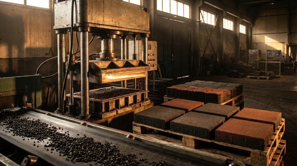 Durable tyre-recycled paver blocks designed for parking areas, walkways, landscapes, and outdoor infrastructure with high load-bearing strength and slip resistance.