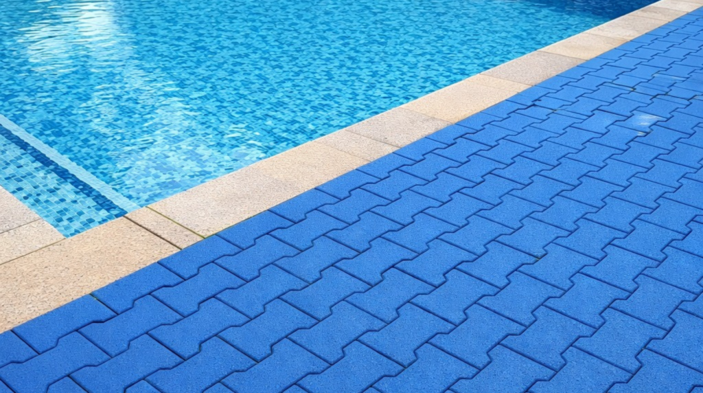 Slip-resistant rubber flooring designed for swimming pool decks, offering water resistance, comfort, durability, and enhanced safety in wet environments.